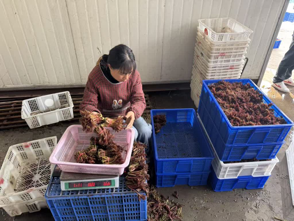 采摘现场,漫山椿树嫩芽饱满,村民背着背篓穿梭其间,熟练采摘头茬椿芽。在分拣、打包、装箱区域,工作人员严格按照标准分级筛选、规范包装,确保新鲜椿芽快速、保质运往市场,打通从田间到餐桌的便捷通道。