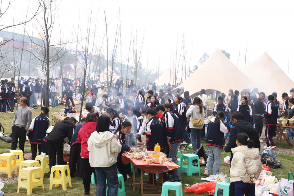 上午9时,各班依次乘车抵达佛来山。家委会代表协助分发烹饪工具与食材,同学们在签到墙打卡留念。野炊环节中,学子们以小组为单位分工协作,洗菜、切菜、穿串、包饺子、烧烤、煮火锅有条不紊,在动手实践中体会劳动快乐,在协作中增进同窗情谊。